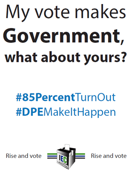 Today DPE is holding a Mascot Exhibition at Mohale's Hoek as part of #85percentTurnOut Campaign Launch . Rise and Vote #DpeMakeItHappen .My vote makes government, what about yours?